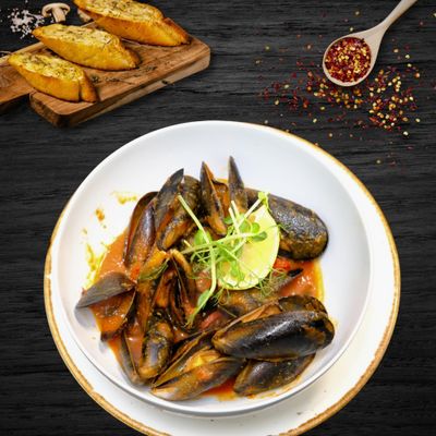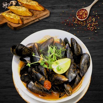 1 kg fresh mussels cooked with Napolitana sauce, garlic, chili, herbs & woodfired garlic bread