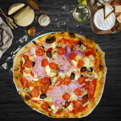 Tomato sauce, mozzarella cheese, ham, artichokes, mushroom, olives