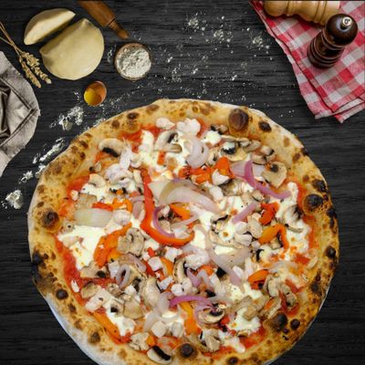Tomato sauce, mozzarella, chicken, mushroom, onion & capsicum