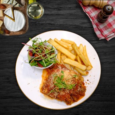 Crumbed chicken breast topped with Napolitana sauce and melted cheese.