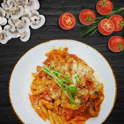 Chicken, mushroom & spinach sauteed in vodka creamy red sauce