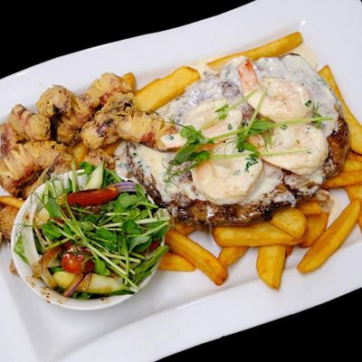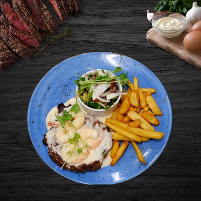 250g prime Scotch fillet steak cooked to your liking, topped with creamy garlic prawns. Served with chips and salad or veg