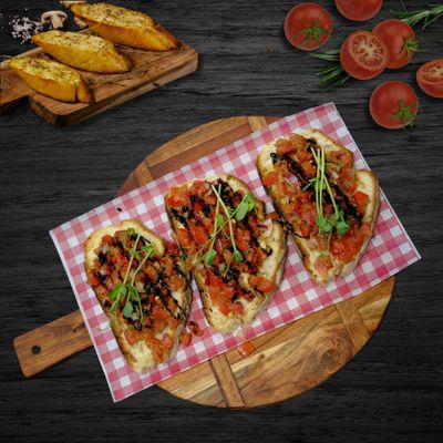 Crusty bread topped with traditional fresh roma tomato, onion, basil & extra virgin olive oil