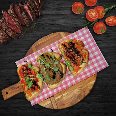 Traditional Roma tomato, onion, basil, Extra Virgin Olive Oil Roast Capsicum with garlic, parsley, olive oil Black Olive Tapenade with garlic, olive oil, basil