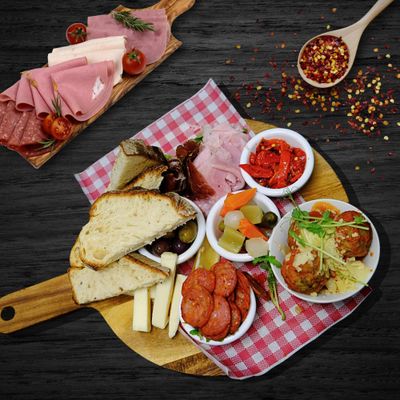 A selection of marinated italian olives, 2x assorted cheeses, grilled italian susage, italian cold meats, Meatballs, marinated pickles, crusty Italian Bread