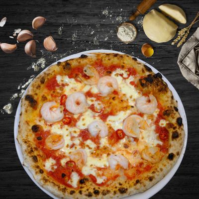 Tomato sauce, mozzarella, large tiger prawns, fresh chilli & olive oil
