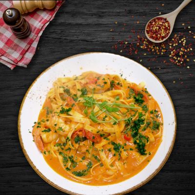 Local prawns w/ chilli served in a creamy red sauce w/ cherry tomatoes & fresh herbs