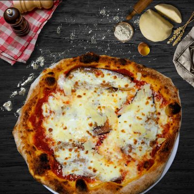 Tomato sauce, fior di latte cheese, roasted eggplant, oregano, grated parmesan & garlic oil