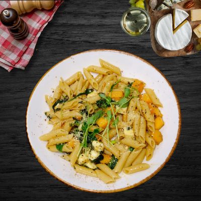 Penne pasta with pumpkin, spinach, feta cheese, garlic & olive oil