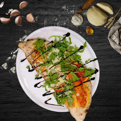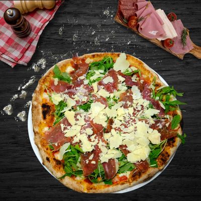 Tomato sauce, mozzarella cheese, prosciutto, rocket, shaved parmesan