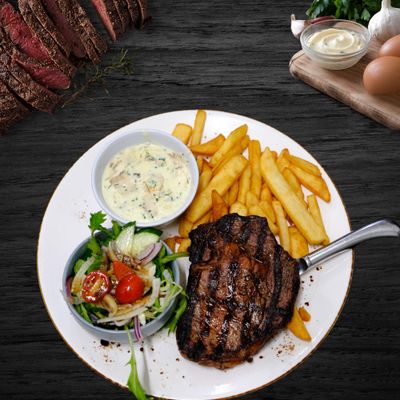 250g prime Scotch fillet steak cooked to your liking. Served with Red Wine Jus, mushroom sauce, or green peppercorn sauce, chips and salad or veg
