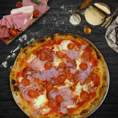 Tomato sauce, mozzarella, cacciatora sausage, pepperoni, ham & bacon