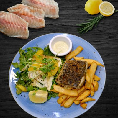 Seasoned grilled Fish served w' rocket, fennel, orange salad & chips
