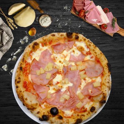 Tomato sauce, mozzarella cheese, ham and pineapple