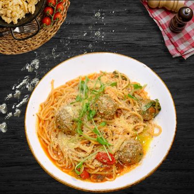 Spaghetti in Napoletana sauce served with traditional Italian meatballs.