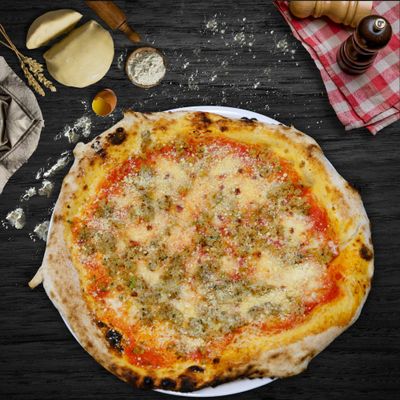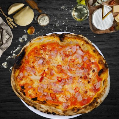 Tomato sauce, mozzarella, bacon, roasted onion, parmesan, fresh chilli & oregano