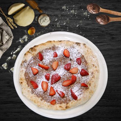 Pizza dough topped with Nutella & Icing sugar, w/ a choice of Strawberries/ Banana
