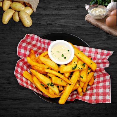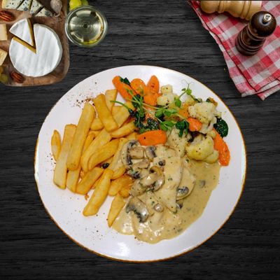 Sauteed chicken medallion in a creamy mushroom and white wine sauce. Served with chips and salad