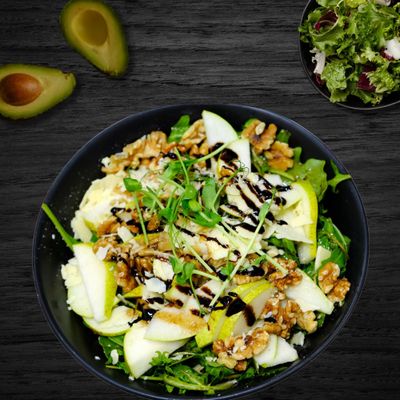 Rocket leaves, Pear, Walnuts, shaved parmesan and Italian dressing