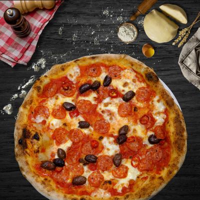 Tomato sauce, mozzarella, pepperoni, olives & chilli